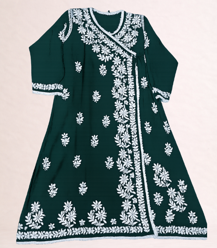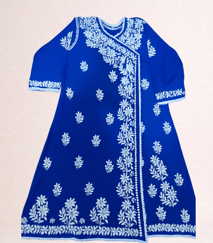 This stunning Angrakha Kurta blends timeless tradition with modern elegance. Crafted in a rich mustard hue, it features a classic wrap-style Angrakha pattern enhanced with delicate white floral embroidery throughout. The V-neckline, side tie-up detail, and long sleeves add refined charm, while the flowing flared silhouette offers effortless grace and comfort. Ideal for festive celebrations, cultural gatherings, or elegant day events, this kurta pairs beautifully with statement earrings and minimal footwear for a regal ethnic look.